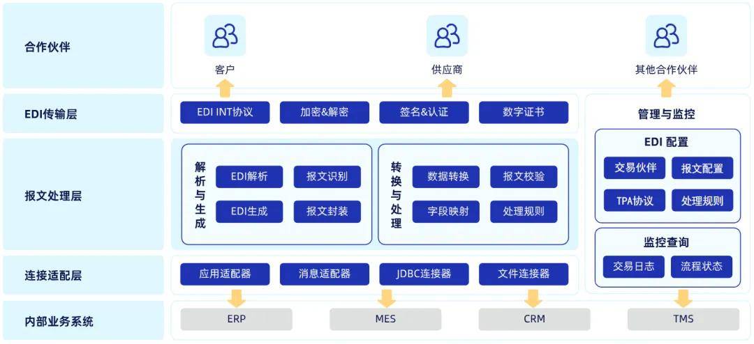 - 降低合规风险,保障业务连续性:100%符合国际贸易伙伴的EDI合规性要求,避免因不合规导致的罚款或业务中断;内置的灾备与高可用机制确保持续运营;完整的端到端数据追溯能力,轻松满足内外审计与行业监管要求。