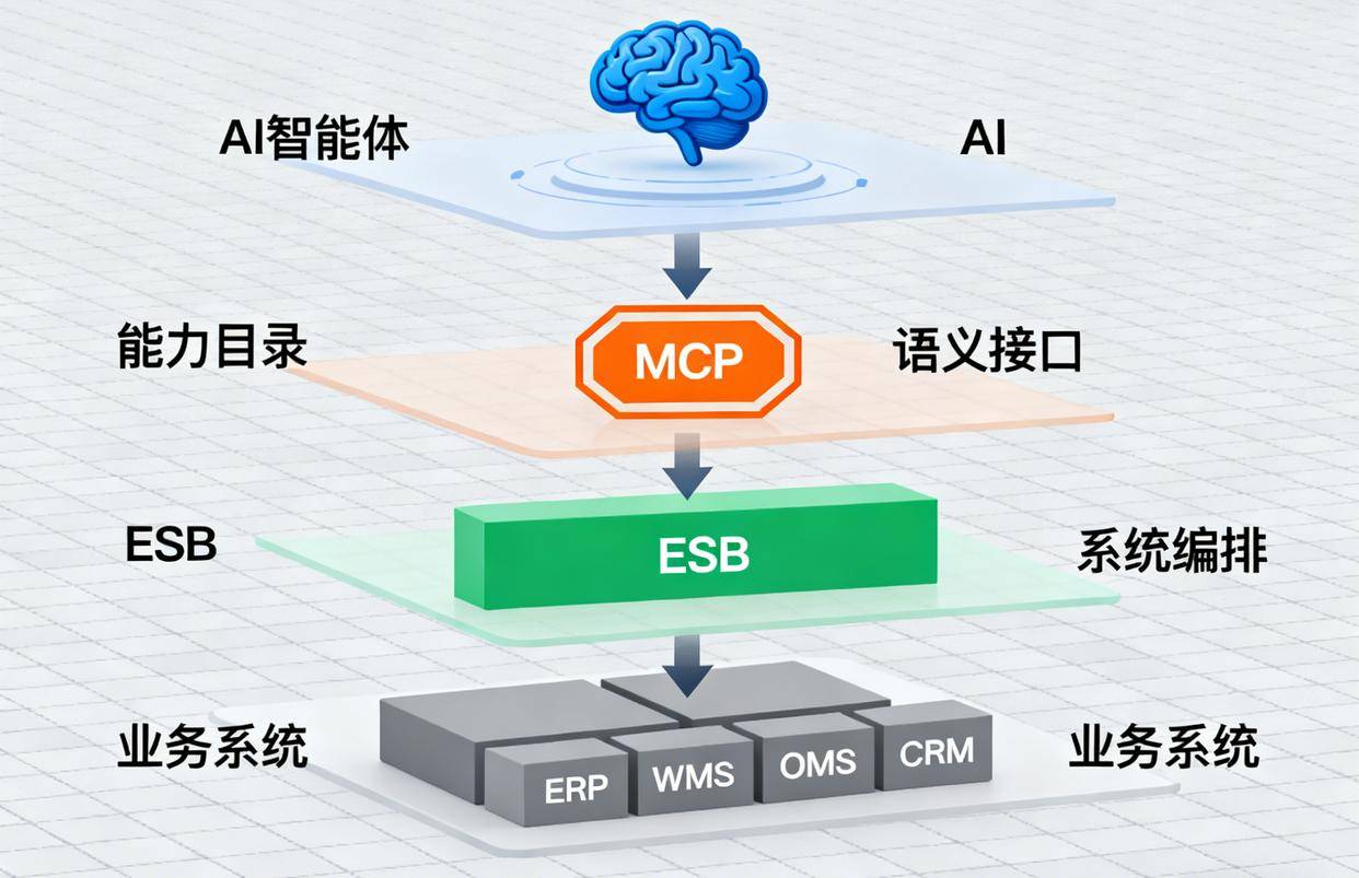 ESB 原本就有丰富的集成功能,而 MCP 主要解决“AI 如何调用业务系统”。二者结合后形成如下协作关系: