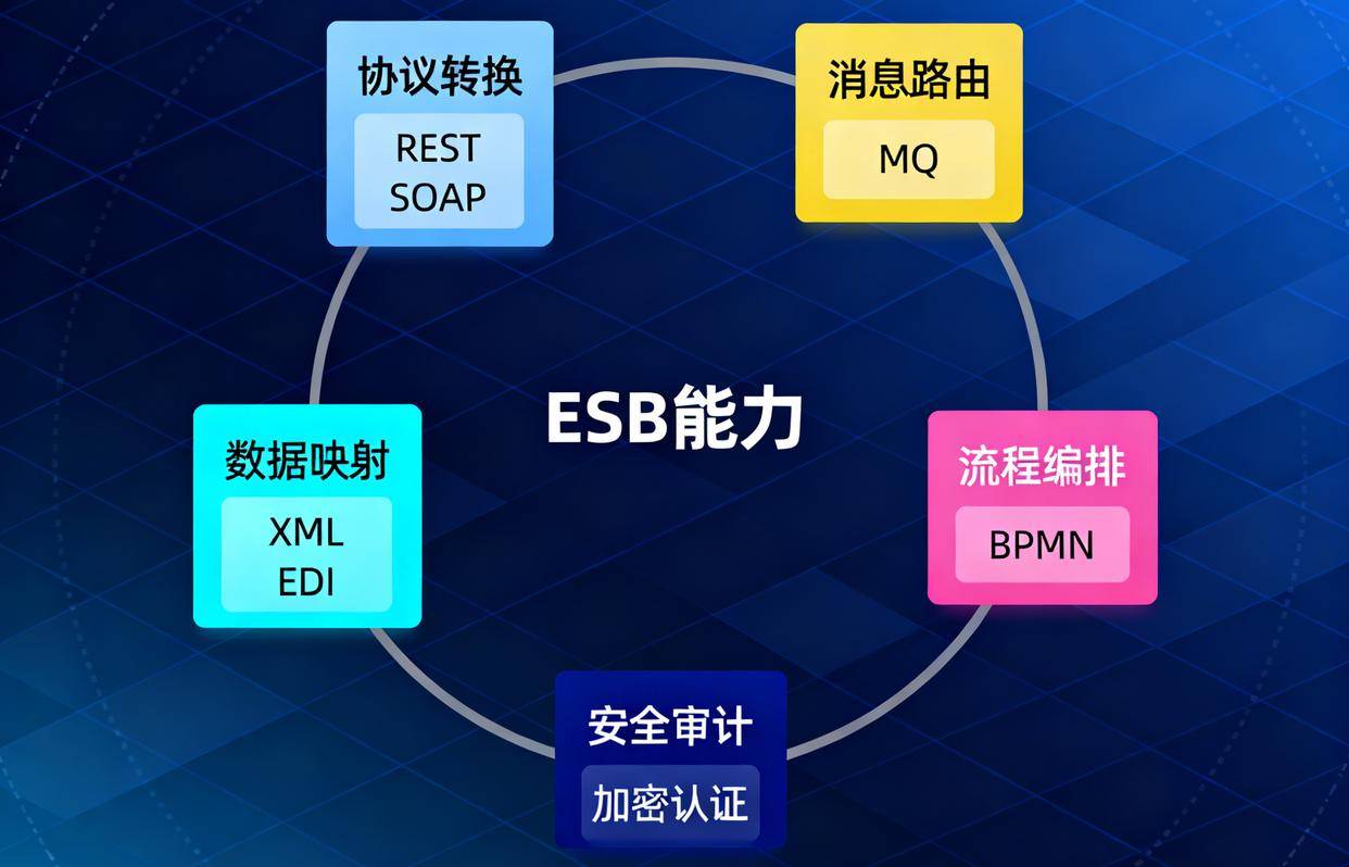 传统 ESB 并不只是“系统连接器”,更是企业集成中枢,主流 ESB 具备以下能力: