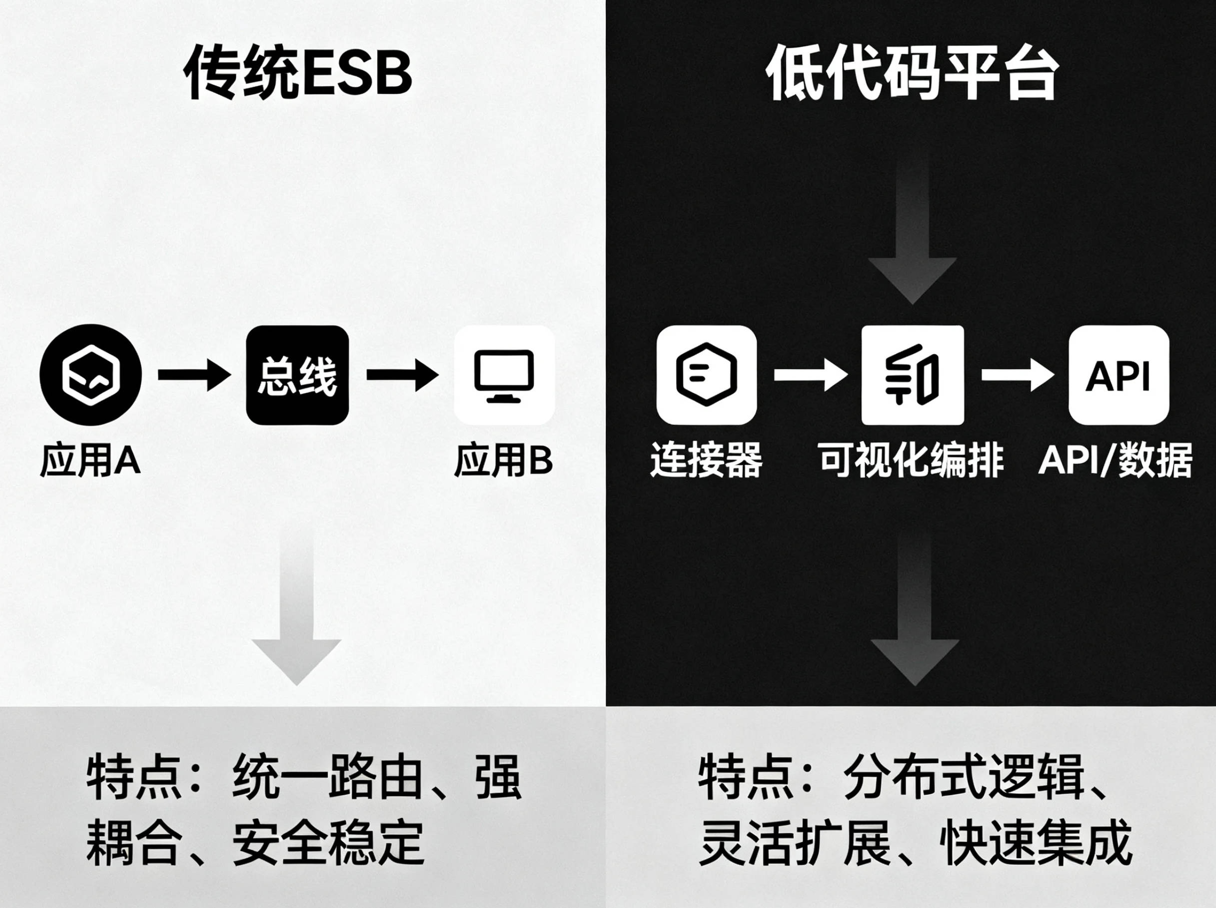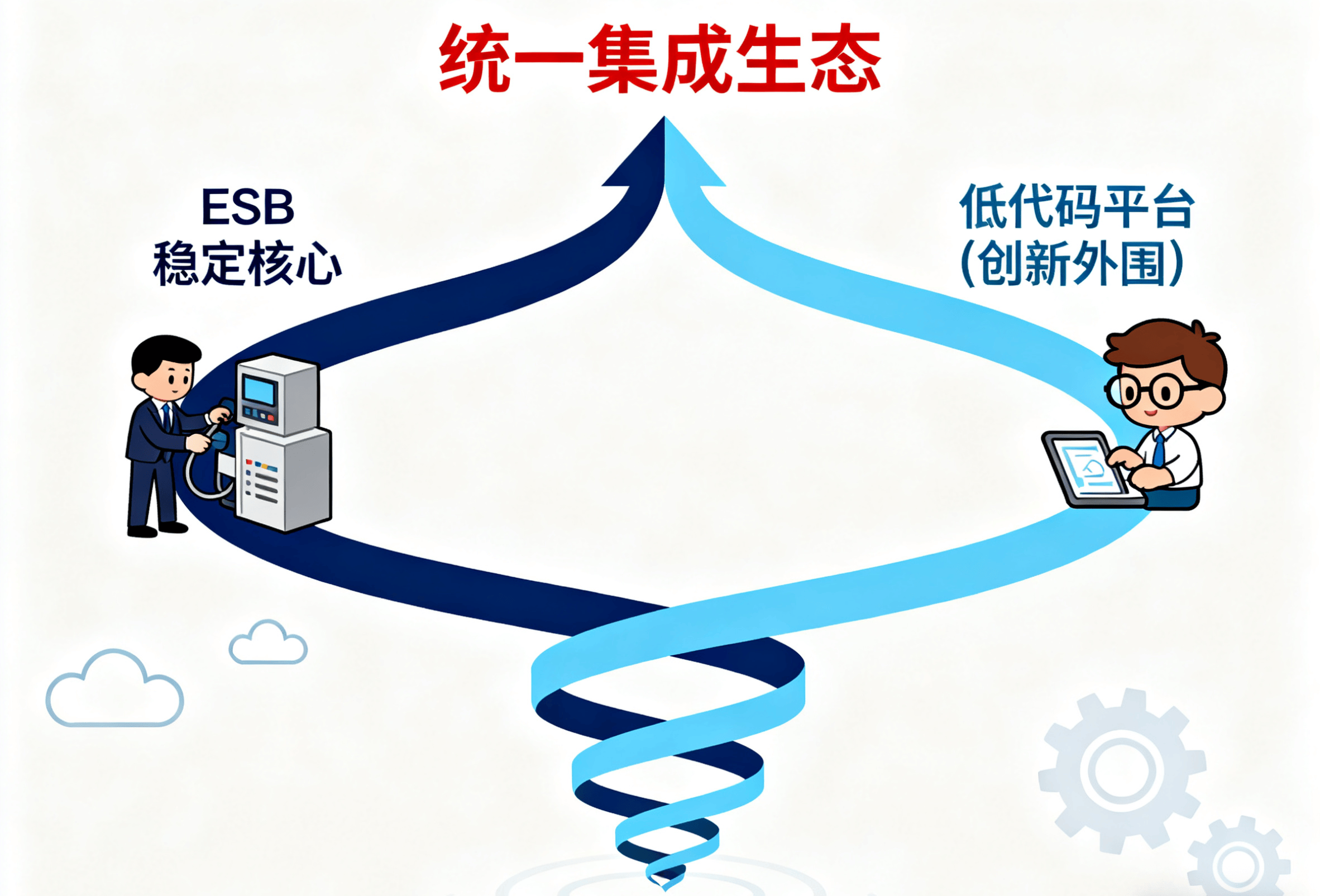 “双轨集成架构”——以传统 ESB 构建稳固核心,以低代码平台实现敏捷创新。