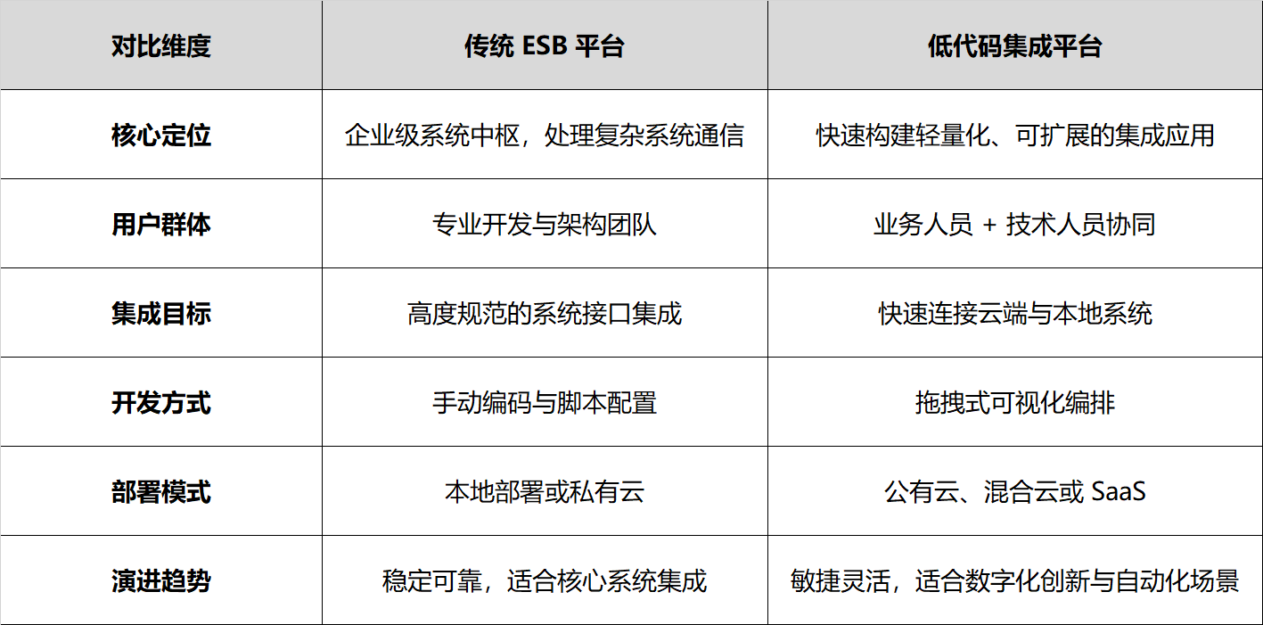 简而言之, ESB 负责提供企业稳定的系统基础设施,低代码集成平台则是敏捷的业务加速器。
